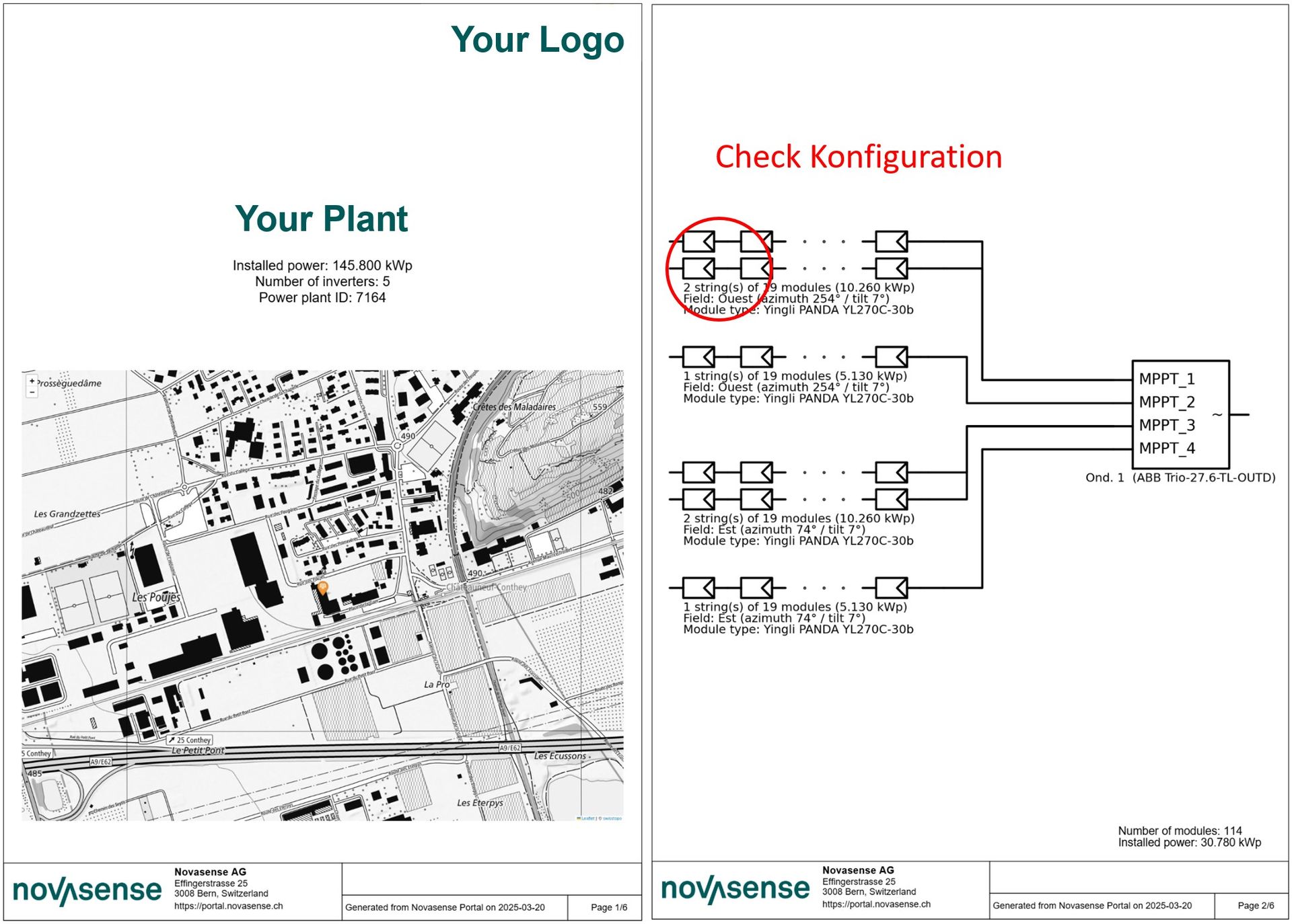 Dank fortschrittlicher Algorithmen und unserer umfassenden Fachkompetenz rekonstruiert Novasense das Layout jeder Anlage und überprüft sie auf Installationsfehler. Dies ermöglicht präventive Massnahmen, die die Effizienz steigern und Verluste auf ein Minimum reduzieren. Ideal nach jeder Inbetriebnahme als Prüfungsprotokoll – die richtigen Erträge von Anfang an.
